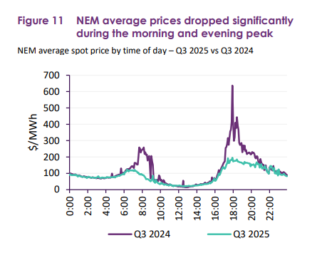 For the 3rd quarter 2025, average wholesale prices for NSW were slightly higher at $90/MWh. However, across the network, average prices were much lower outside peak usage hours and particularly lower between 9am and 4pm. From the same AEMO report, Figure 11 on page 15: