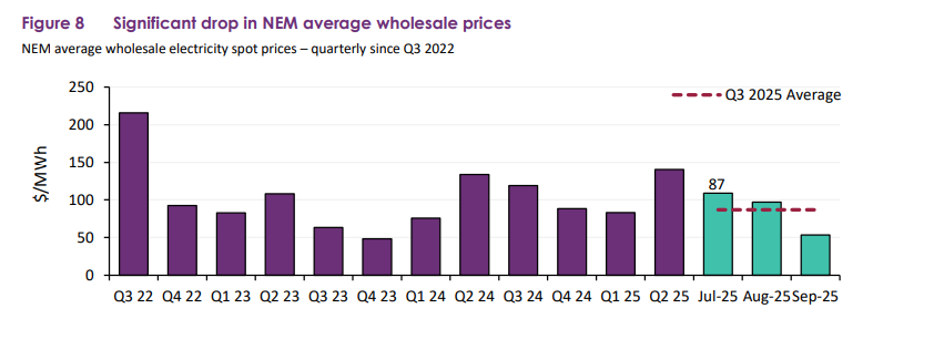 In Q3 2025, wholesale electricity prices across the NEM averaged $87/MWh, down 27% from Q3 2024 and 38% from Q2 2025 (Figure 8). Lower price volatility and higher renewable output offset the impact of increased operational demand, resulting in average prices of $109/MWh in July and $97/MWh in August. Seasonally lower demand and warmer sunnier weather conditions pushed September prices further down to $53/MWh.